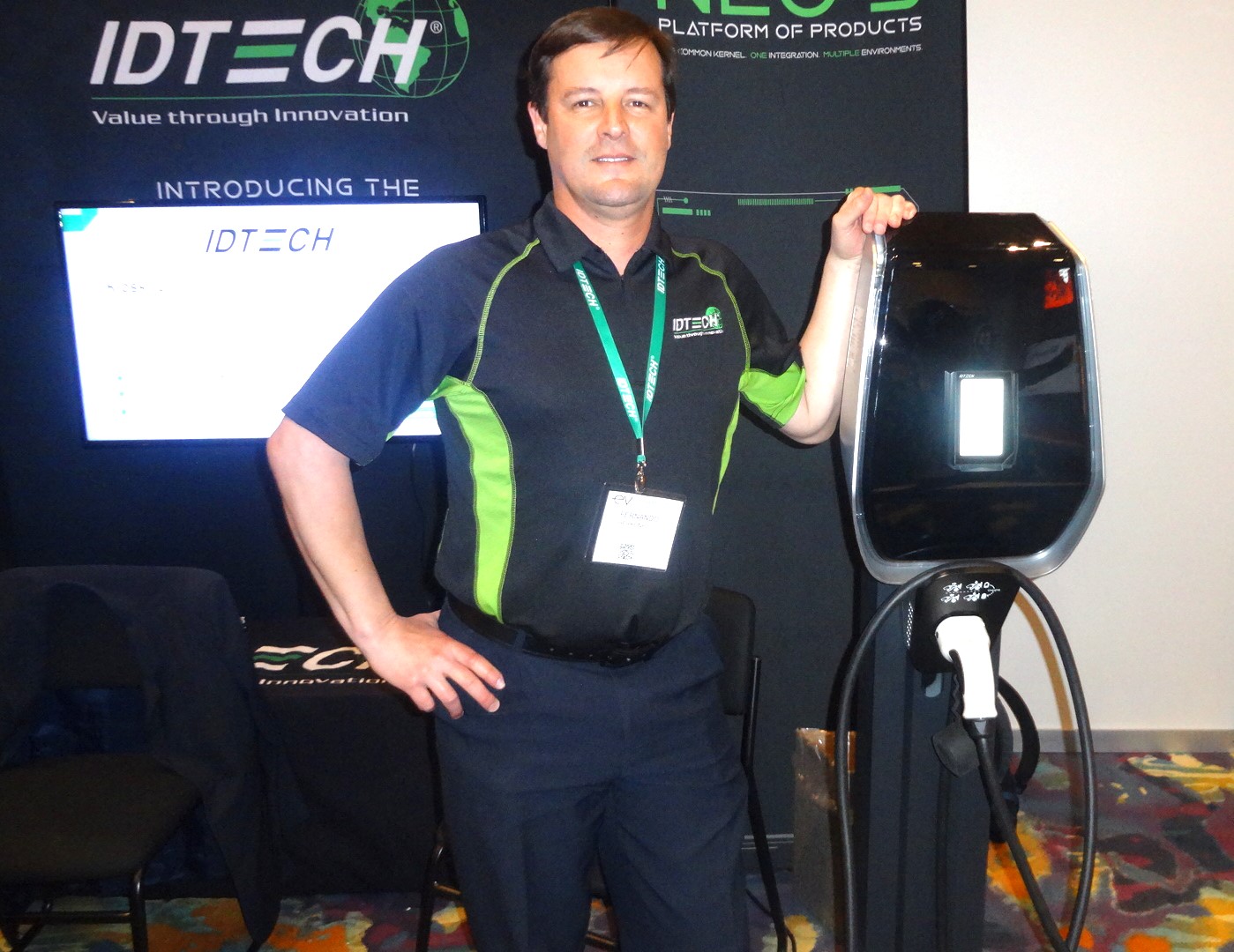 Fernando Herkenhoff shows an EV charger equipped with the NEO 3 payment device at the ID Tech exhibit. |