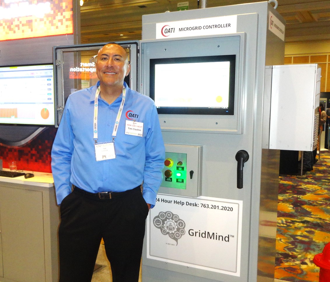 Tim Clashin shows the microgrid controller at the OATI exhibit. |