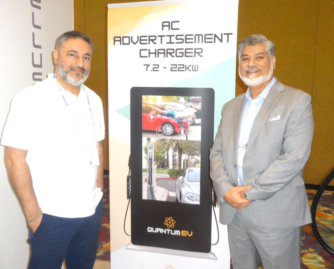 Assad Khan and Fazal Husain present the advertisement charger at the QuantumEV exhibit. |