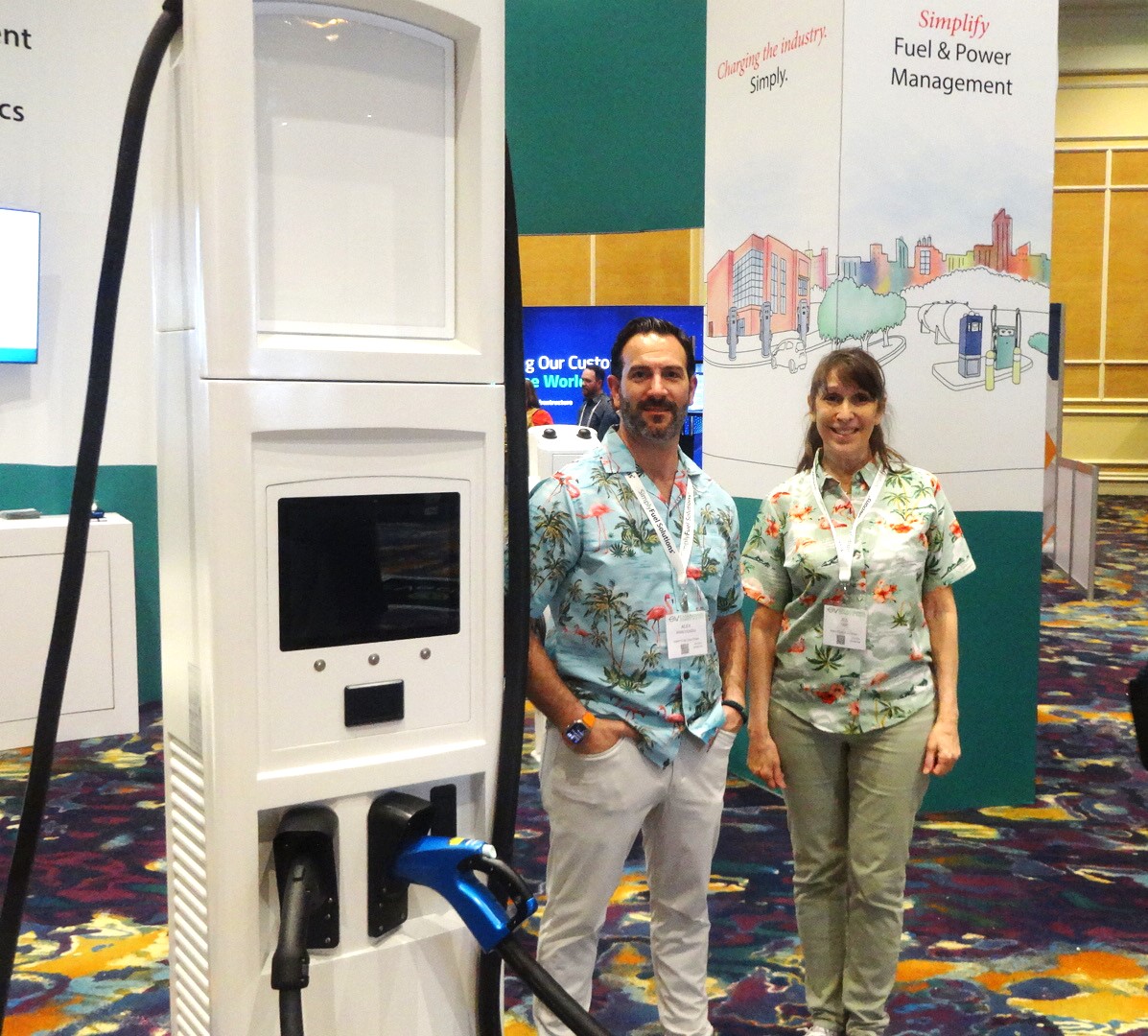 Alex Arredondo and Jill Orr present the EV charging solutions at the Simply Fuel Solutions exhibit. |