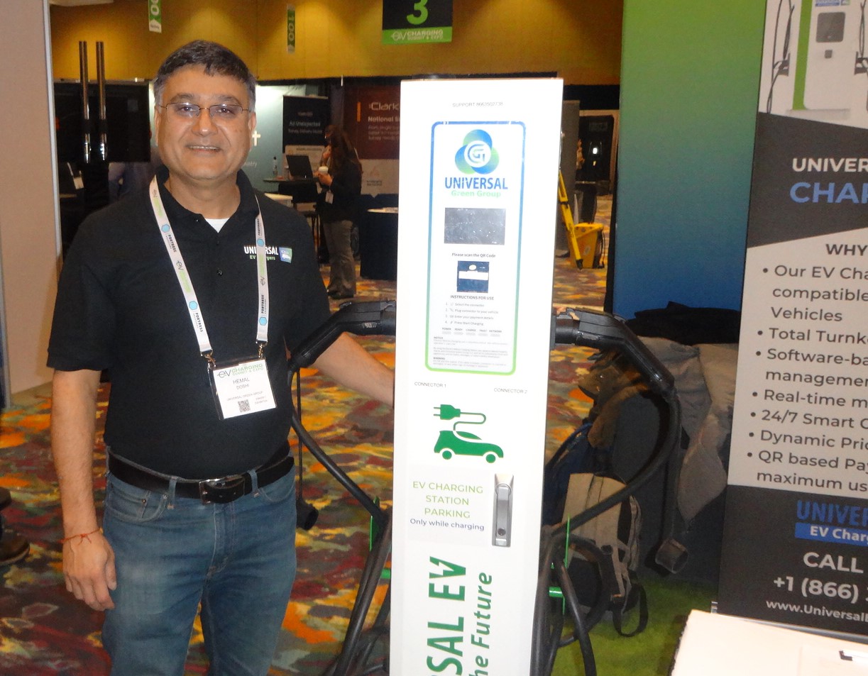Hemal Doshi presents the Universal EV charger at the Universal Green Group exhibit. |
