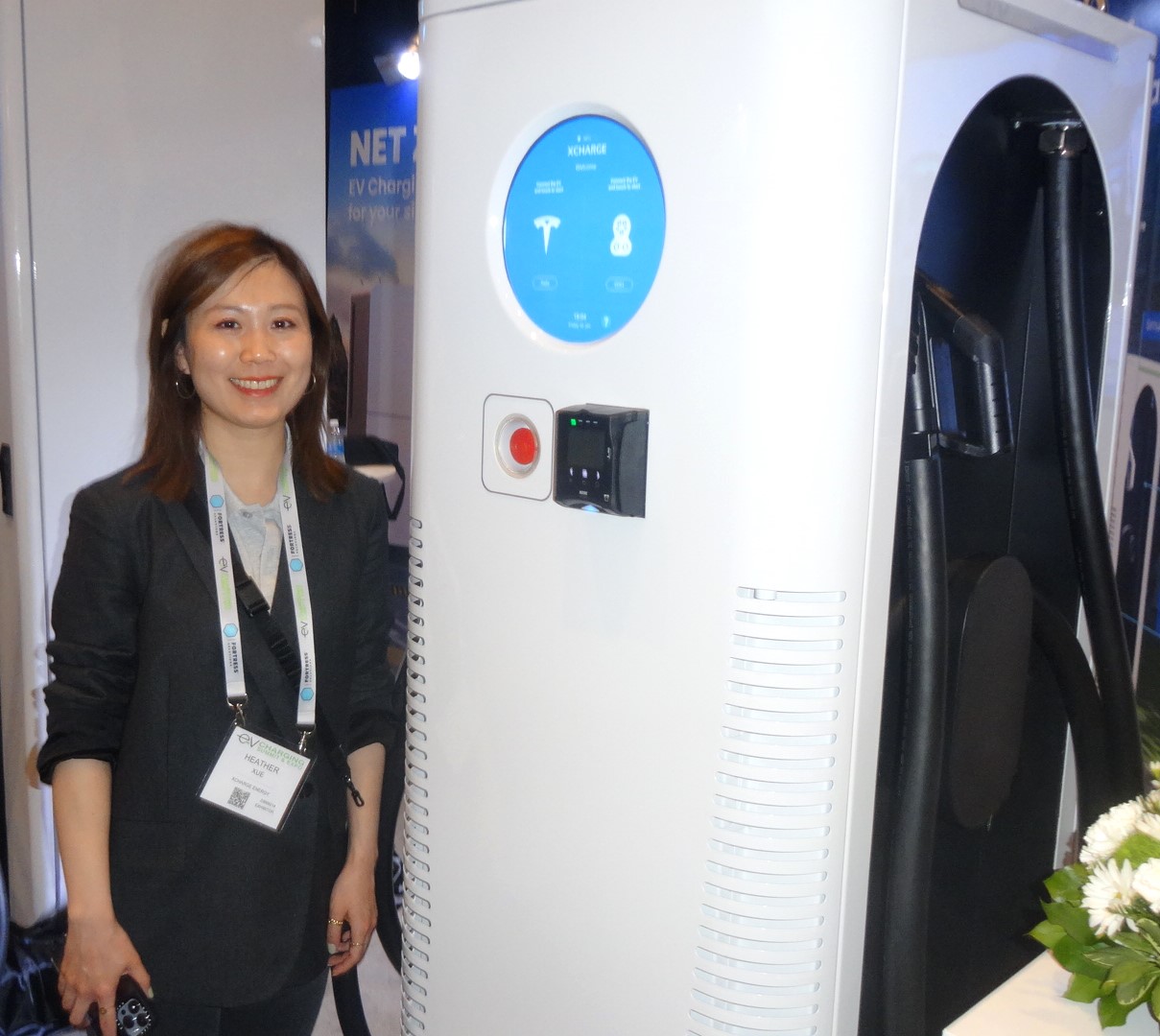 Heather Xue presents the EV charger with a Nayax card reader at the xCharge North America exhibit. |