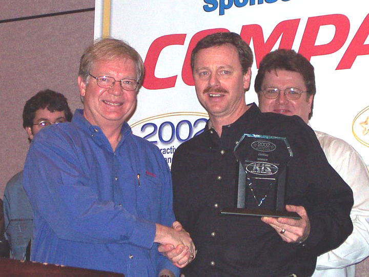 Kiosk Information Systems president Rick Malone, right, receives an Interactive Kiosk Excellence Award from Compaq's Steve Bellinghausen. |
