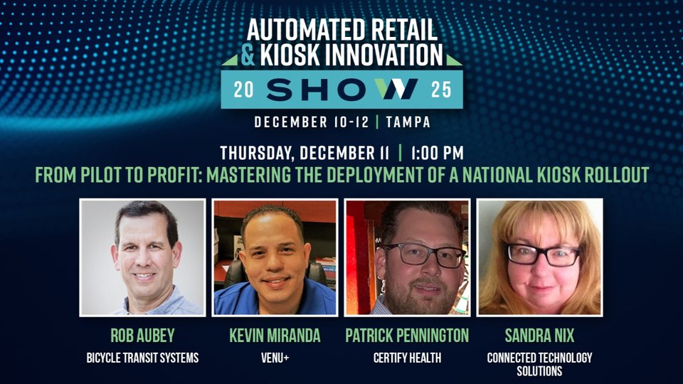 This panel, entitled "Mastering the Deployment of a National Kiosk Rollout," will compile experts who have succeeded in this endeavor, such as retailers and a specialized reseller. Sandra Nix, president and CEO of Connected Technology Solutions will moderate the panel with panelists Rob Aubey, director of TechOps and supply chain logistics at Bicycle Transit Systems, Kevin Miranda, senior product manager at Venu+ and Patrick Pennington, enterprise account executive at CERTIFY Health.