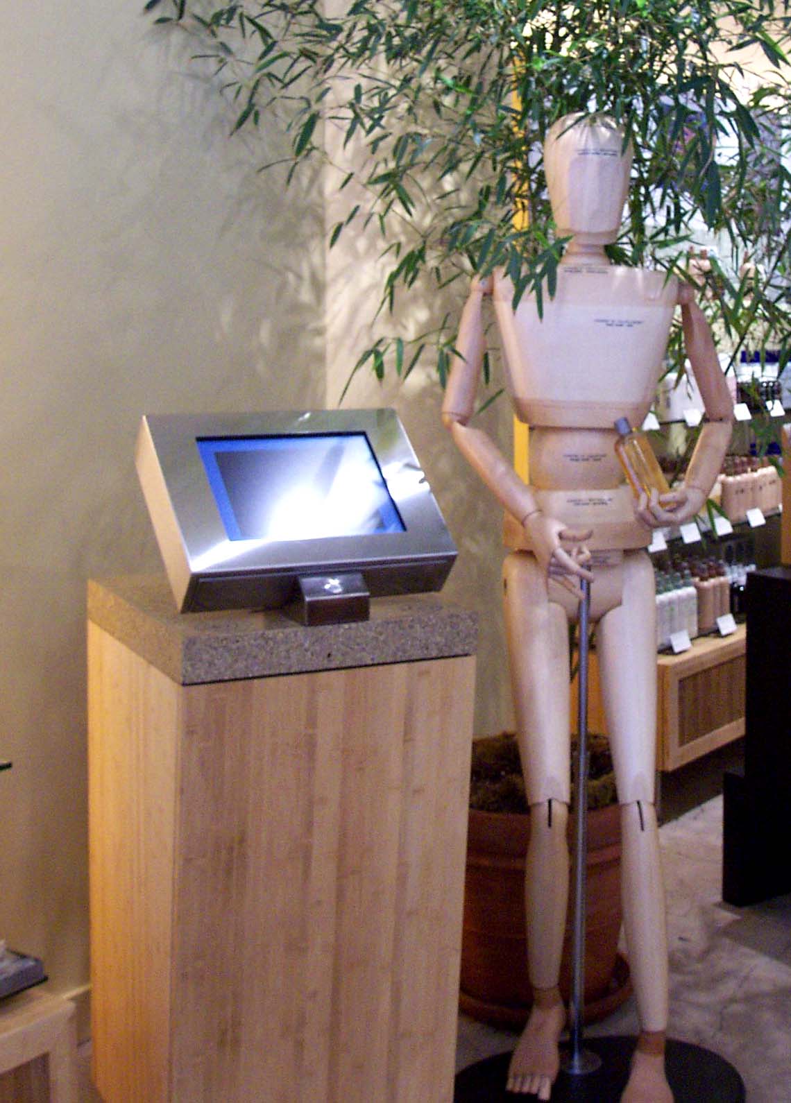 One is the plasma screen, which Jo Malone envisioned as a customer lure. The second is in the aroma field. While the Aveda kiosk allows customers to sample individual scents, the Jo Malone system blend scents.