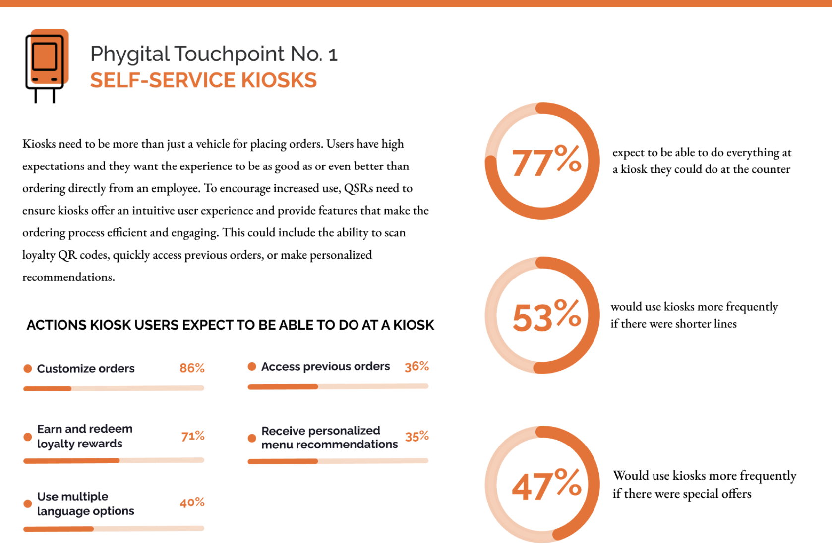 Asked what actions kiosk users expect to be able to do at a kiosk, 86% said customize orders, 71% said earn and redeem loyalty rewards, 40% said use multiple language options, 36% said access previous orders and 35% said receive personalized menu recommendations.