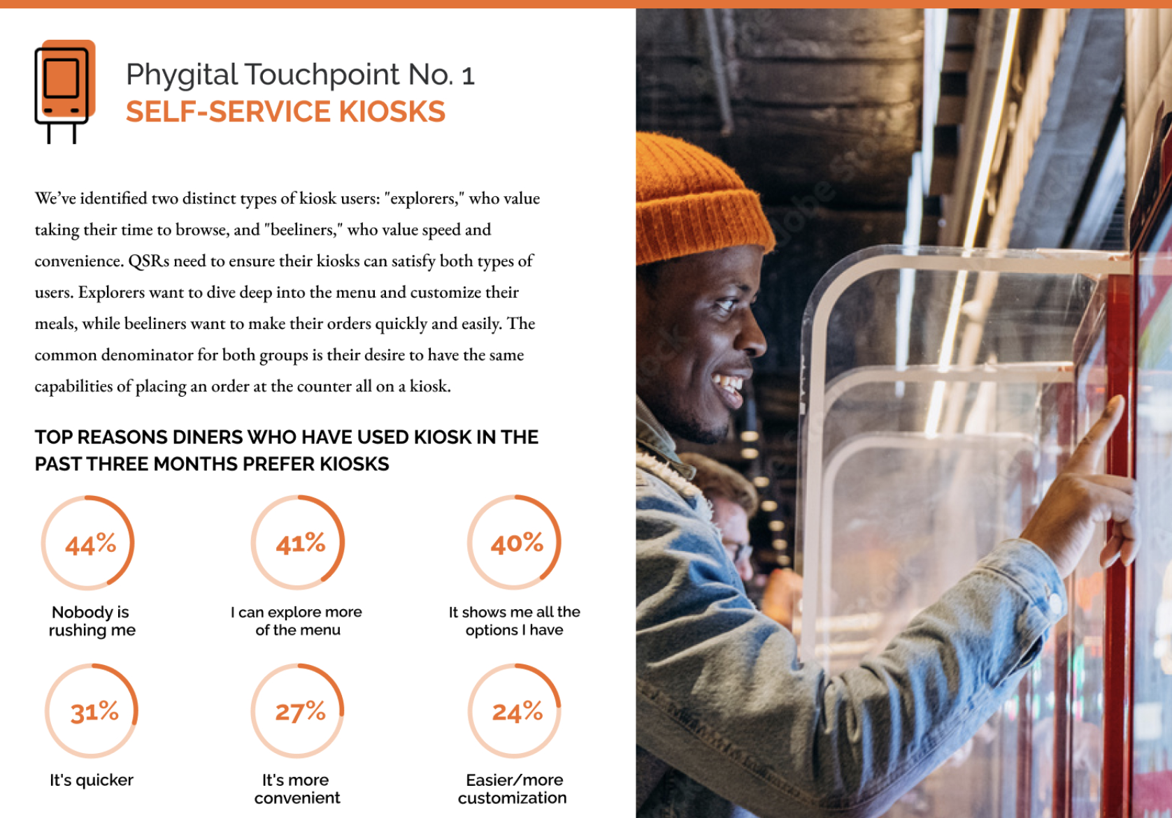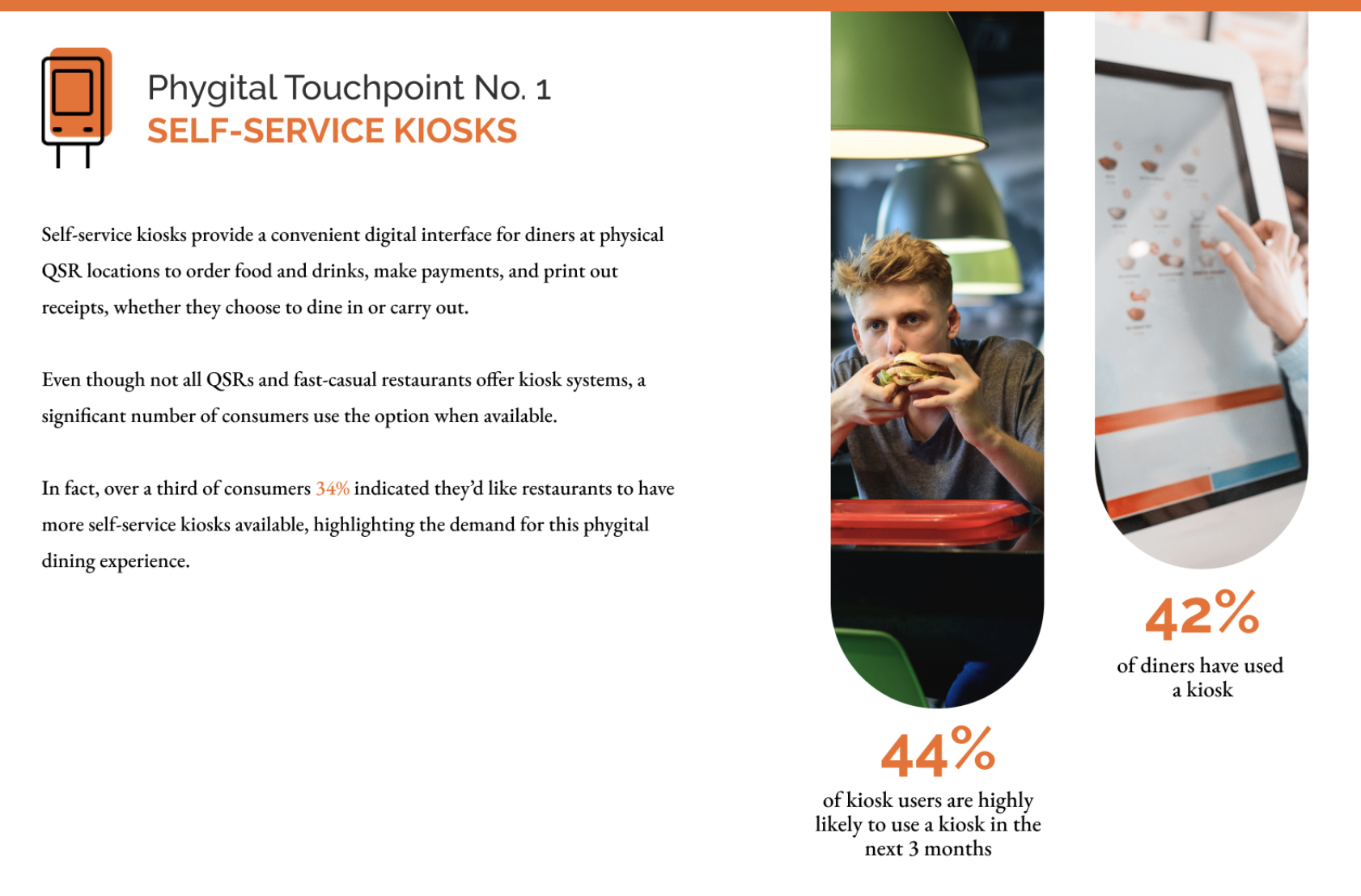 Self-service kiosks provide a convenient digital interface for diners at physical QSR locations to order food and drinks, make payments and print out receipts, whether they choose to dine in or carry out.