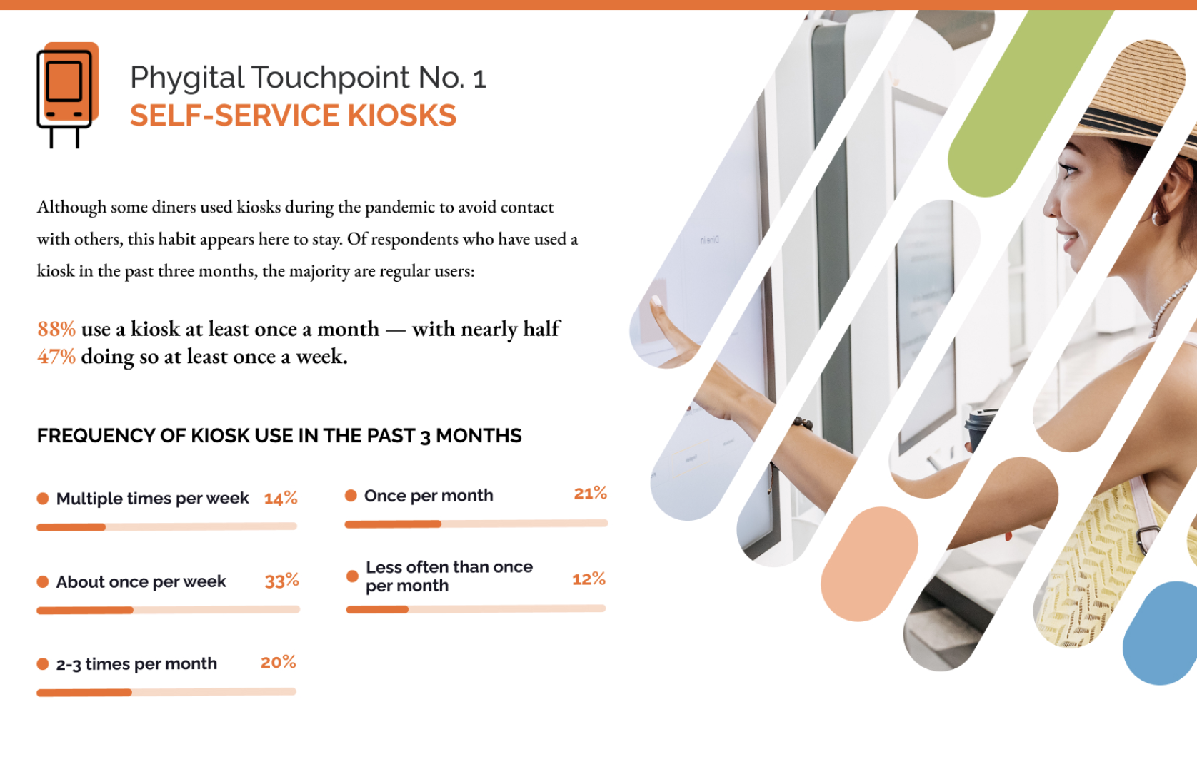 Although some diners used kiosks during the pandemic to avoid contact with others, it seems like this habit is here to stay. Of respondents who have used a kiosk in the past three months, the majority are regular users: 88% use a kiosk at least once a month — with nearly half (47%) doing so at least once a week.