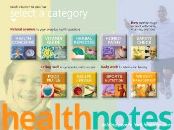 Healthnotes Version 7 features a database of cross-linked articles presented on a touchscreen. Using the kiosk, customers can browse sections on health concerns, vitamins, herbal remedies, homeopathy, safety, food notes, recipes, sports nutrition, and weight management. The sections are part of three main Healthnotes products: Food Notes, Health Notes and Safety Checker.