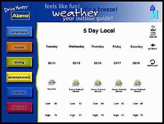 Travelers renting cars from Alamo Rent-A-Car can now have access to a variety of local information, using a simple touch screen and the Sun Ray system. For example, travelers can print a directory of hotels, restaurants, department and specialty stores, and entertainment venues, complete travel-book-style descriptions of preferred locations with addresses, telephone numbers, driving directions and maps, all from the convenience of the Apunix kiosks. Also included are print-outs for promotions, and a web browser giving local, five day weather forecasts.