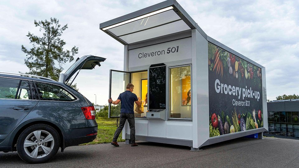 The automated, temperature-controlled kiosk, created by Cleveron, provides a contactless pickup experience. Customers who select the "Kiosk PickUp" option will be offered two-hour time slots during which to pick up their groceries.