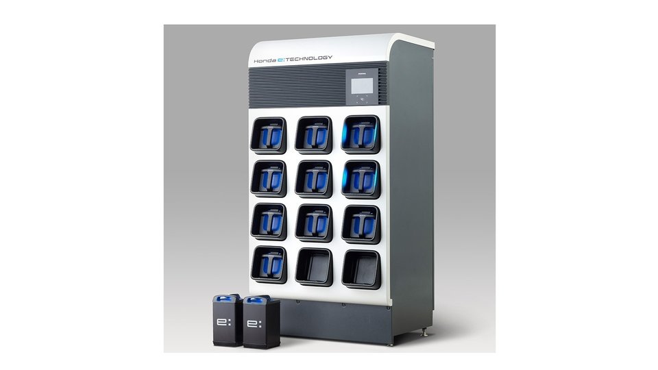 The Honda Power Pack Exchanger e: is a battery swapping station that simultaneously charges multiple units of Honda Mobile Power Pack e: and enables smooth battery swapping for users of electric motorcycles and other mobile products equipped with MPP e:.