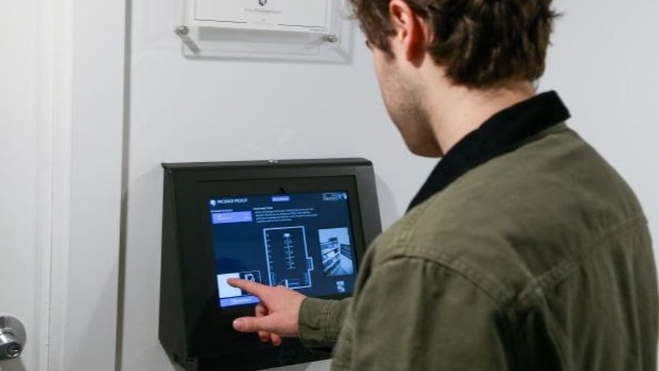A courier can scan the packages' label at the entry point kiosk, unlock the door and place an item onto the shelf. Once on the shelf, computer vision technology monitors each package, while automatically generating a notification with a QR code to the resident via email or text. The resident then scans the QR code at the room's secure entryway to open the door, where audio and lasers guide them to their package. If an incorrect item is taken from the shelf, an audio notification will alert the resident to their mistake.