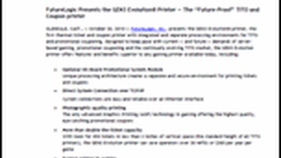 GLENDALE, Calif., — October 20, 2010 — FutureLogic, Inc., presents the GEN3 Evolution® printer, the first thermal ticket and coupon printer with integrated and separate processing environments for TITO and promotional couponing. Designed to keep pace with current — and future — demands of server-based gaming, promotional couponing and the continually evolving TITO market, the GEN3 Evolution printer offers features and benefits superior to any gaming printer available today.